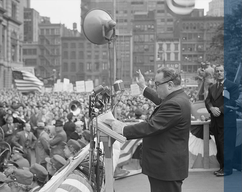 New information was difficult for American media outlets to obtain; CBS World News' radio program from the day makes multiple references to German media broadcasts, which were the main source of updated information. In Philadelphia, the mayor sounded the Liberty Bell for the first time in over a century. In New York City, the New York Stock exchange observed two minutes of silence and in Madison Square, WNYC held a D-Day rally, featuring speeches and songs presided over by the city's mayor Fiorello La Guardia. Like Roosevelt, La Guardia led the city in a prayer, telling those gathered—and those listening at home on their radios: "We, the people of the City of New York, in meeting assembled, send forth our prayers to the Almighty God for the safety and spiritual welfare of every one of you and humbly petition Him to bring total victory to your arms in the great and valiant struggle for the liberation of the world from tyranny."