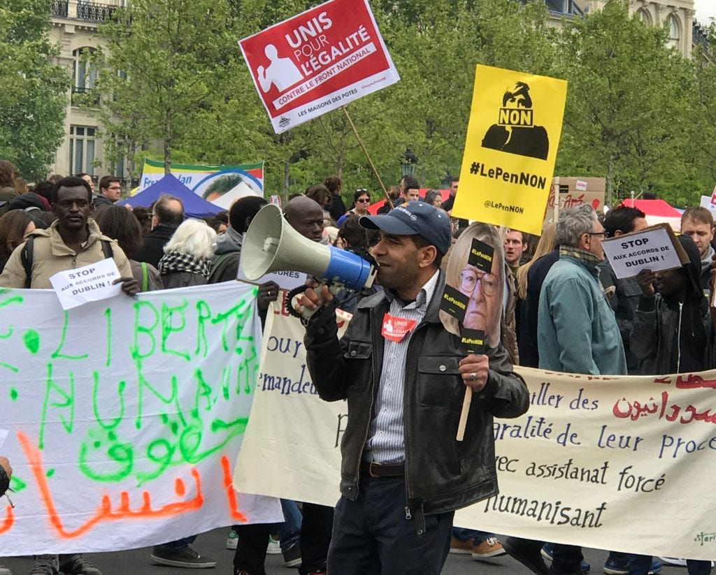 One of many group wranglers. His poster says "Le Pen No," but his group's main concern seemed to be deportations.