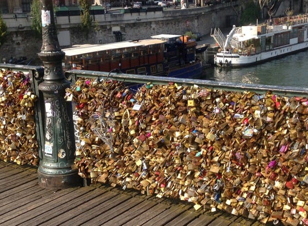 For five years, lovers in Paris have demonstrated their eternal fealty by attaching padlocks to the Pont des Arts, an elegant old footbridge that connects the Louvre Museum to the Institut de France across the Seine, then throwing the key in the river -- 700,000 of them so far.