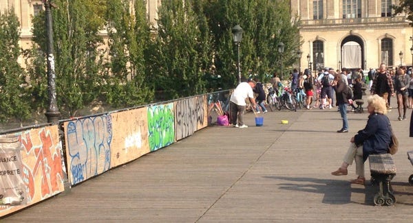 There's been a publicity campaign against them, and in recent months the City of Paris has had to cover some of the panels with plywood to keep more from being added. The plywood, of course, has become the substitute for the locks -- visiting lovers now autograph it and, Paris being Paris, the more assertive graffiti artists also visit. As a result, the bridge is much less welcoming to lovers or padlock vendors.