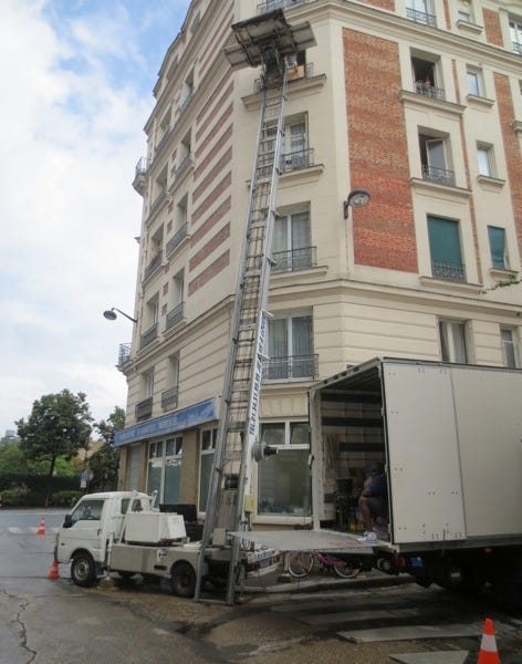 THE STAIRWELLS and elevators of Paris apartment buildings are notoriously cramped, so the city’s movers have developed their own conveyor system to get furniture out through a window. This one, just off the busy Rue Froidevaux in the Montparnasse district, is just across the street from Montparnasse Cemetery, final resting place for many artists and publishers, as well as policemen and firefighters killed in the line of duty and not a few foreigners.