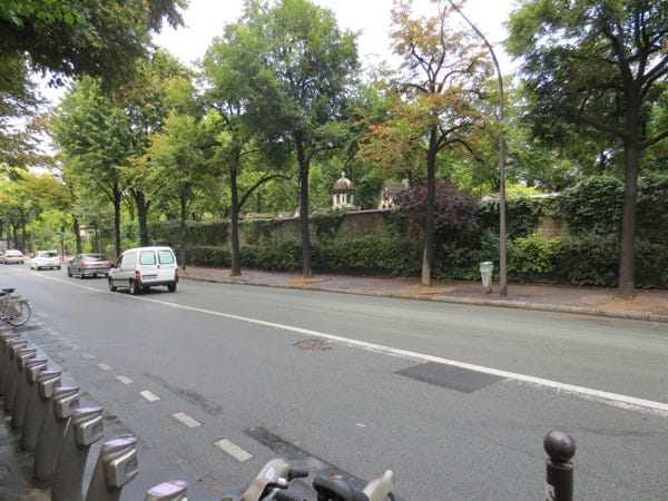 The rear wall of Montparnasse Cemetery along Rue Froidevaux. In the foreground is a station for the popular Vélib rental bicycles. Photos by John Pearce