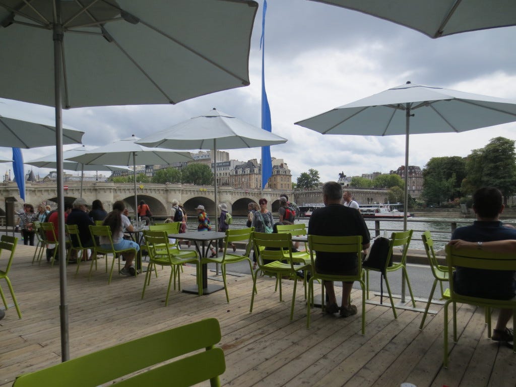 What's a beach without a restaurant? This one is full all the time, and has a great view of the Seine. The bridge in the distance is the Pont Neuf which, despite its name, is the oldest in the city. The famous statue of Henri IV appears above the head of the diner in the center.