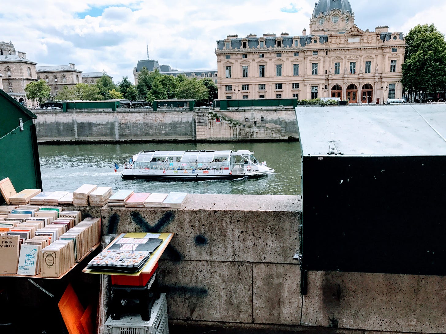SOPHIE LEROUX'S WALK across the Seine is one of the important early scenes in my new novel Finding Pegasus.The scene traces her walk across the Île de la Cité, home to Notre Dame Cathedral and the Sainte-Chapelle, to the quai on the Left Bank, where she and her young son Lucas witness the murder that's central to the plot. This is a picture of that quai that I took a few months ago. Pont Neuf (which, despite its name, is the oldest bridge in Paris) lies in the background. Sophie is the late-life daughter of a World War Two associate of General de Gaulle. She inherited her father's apartment overlooking the Seine (in fact, just to the left at the end of the Pont Neuf). She makes friends easily and has a smart and charming young son, Lucas, who she is walking home across the Seine. Lucas witnesses a murder that sets up the entire plot of the book. On the far side of the Seine, where Sophie waits for Lucas to arrive on the bus, she stands at the stone rampart next to the green box from which a bouquiniste sells books, smoking.