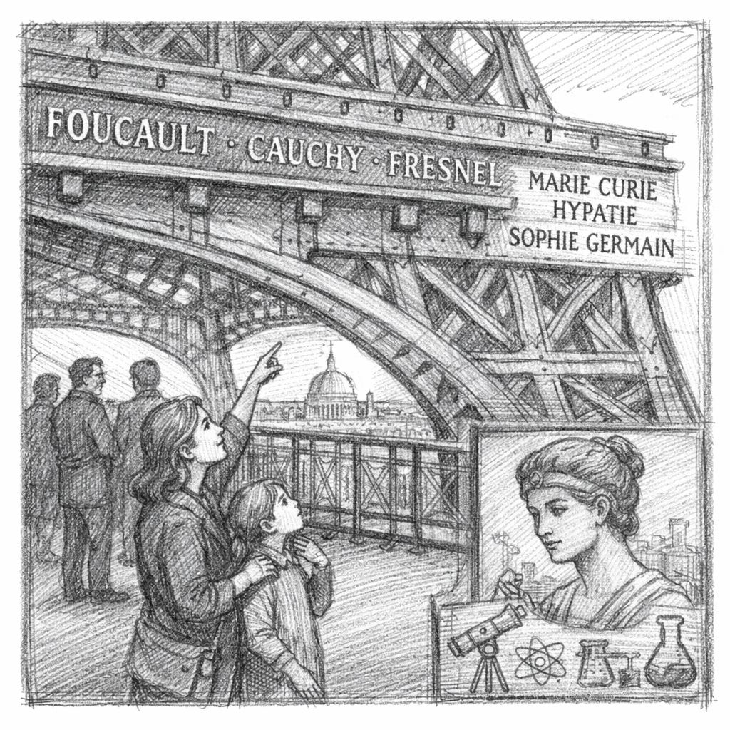 At the first level of the tour Eiffel, the wide iron gallery just above the swirl of visitors and the wind off the Seine, something remarkable has been quietly hiding in plain sight for more than a century. Encircling the iron structure are the names of seventy-two scientists—Foucault, Fresnel, Cauchy, Belgrand—picked in the late 1880s as emblems of French scientific progress. Their names, spelled out in gold, were meant to announce to the world that modernity had arrived.