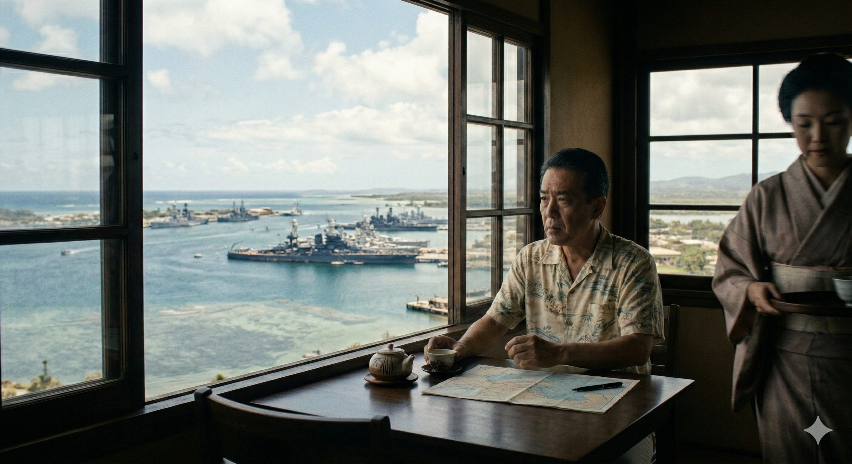 He rented cars and drove to hilltop viewpoints. He took tourist boat rides past the naval station. He found a teahouse on Alewa Heights with a clear sightline to the anchorage, became a regular, and let the geishas pour his sake while he counted warships. He is reported to have swum off Ford Island to gauge the water depth — critical intelligence, as it turned out, for modifying Japanese torpedoes to run shallow in the harbor’s confined waters.